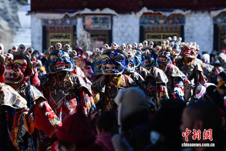 图为楚布寺僧人们佩戴面具表演。中新社记者 贡嘎来松 摄