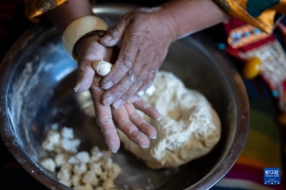 2月16日,长所乡古荣村村民卓玛次仁在制作年节食品“古突”。