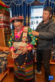 2月16日,长所乡古荣村村民桑杰(右)给爱人卓玛次仁佩戴首饰。