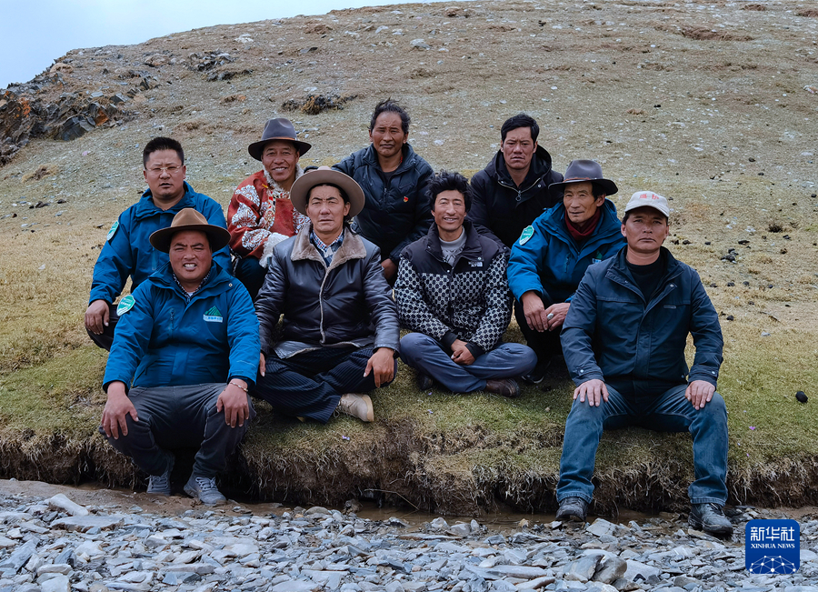图为2023年5月25日拍摄的曲麻莱县勒池村藏羚羊迁徙护航队队员合照,前右二为尕桑。新华社记者 柳泽兴 摄