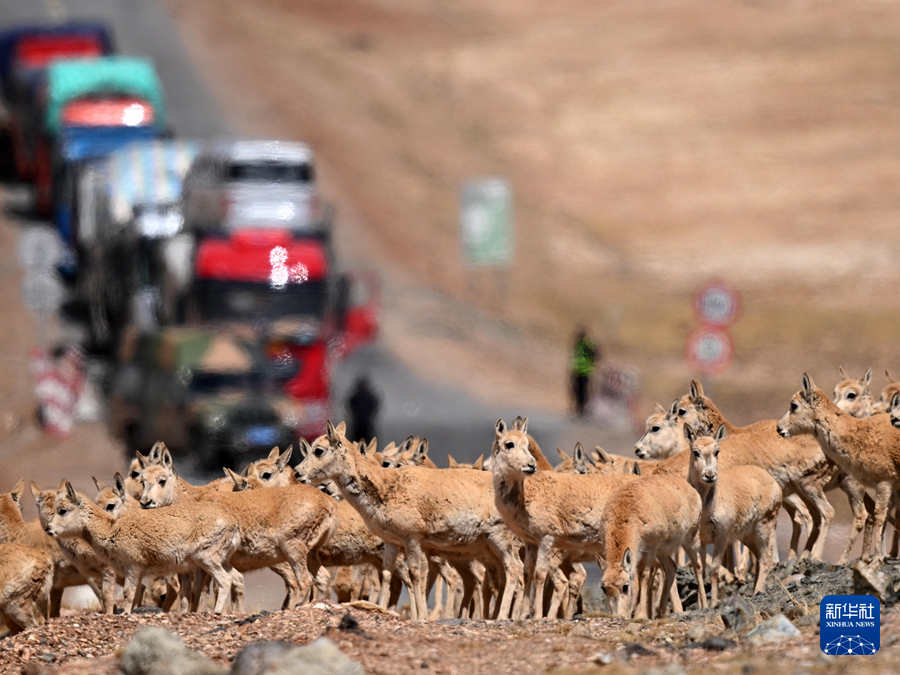 一群待产雌性藏羚羊通过青藏公路前往可可西里卓乃湖产仔(2023年5月29日摄)。新华社记者 张宏祥 摄