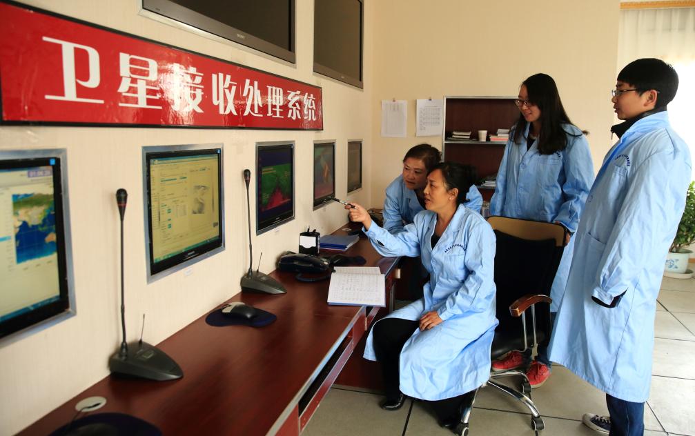扎西央宗(左二)正在和同事探讨遥感业务。(受访单位供图)