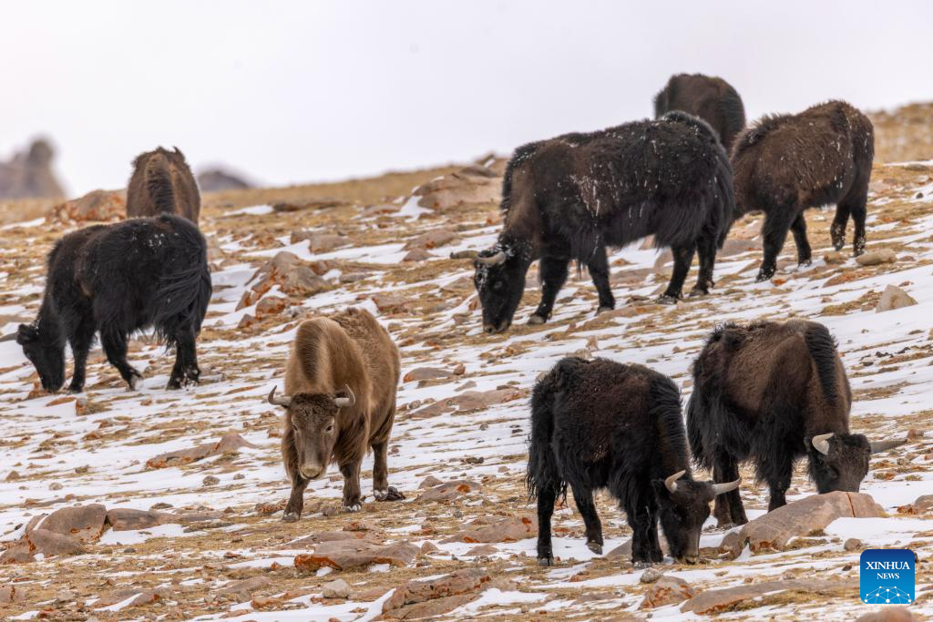 这是在藏色岗日冰川附近拍摄的野牦牛群(3月16日摄)。新华社发(四郎江村摄)