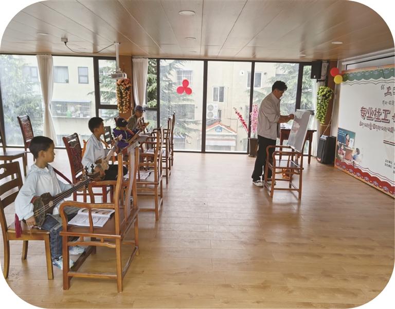 “社区爸爸”正在教孩子们学习乐器。图由白玛岗社区提供