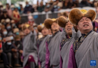 3月28日,演员在拉萨市宗角禄康公园内举办的西藏百万农奴解放纪念日群众演出活动上表演。新华社记者 晋美多吉 摄