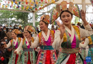 3月28日,演员在拉萨市宗角禄康公园内举办的西藏百万农奴解放纪念日群众演出活动上载歌载舞。新华社记者 丁增尼达 摄