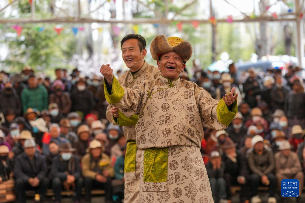3月28日,演员在拉萨市宗角禄康公园内举办的西藏百万农奴解放纪念日群众文艺演出活动上表演相声。新华社记者 晋美多吉 摄