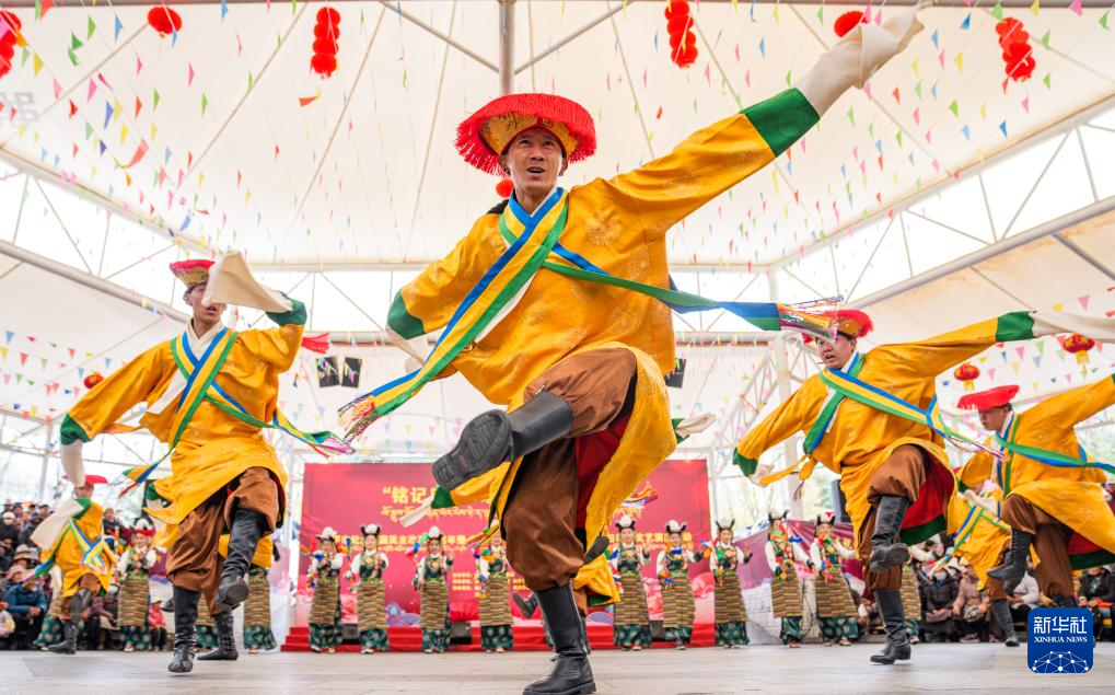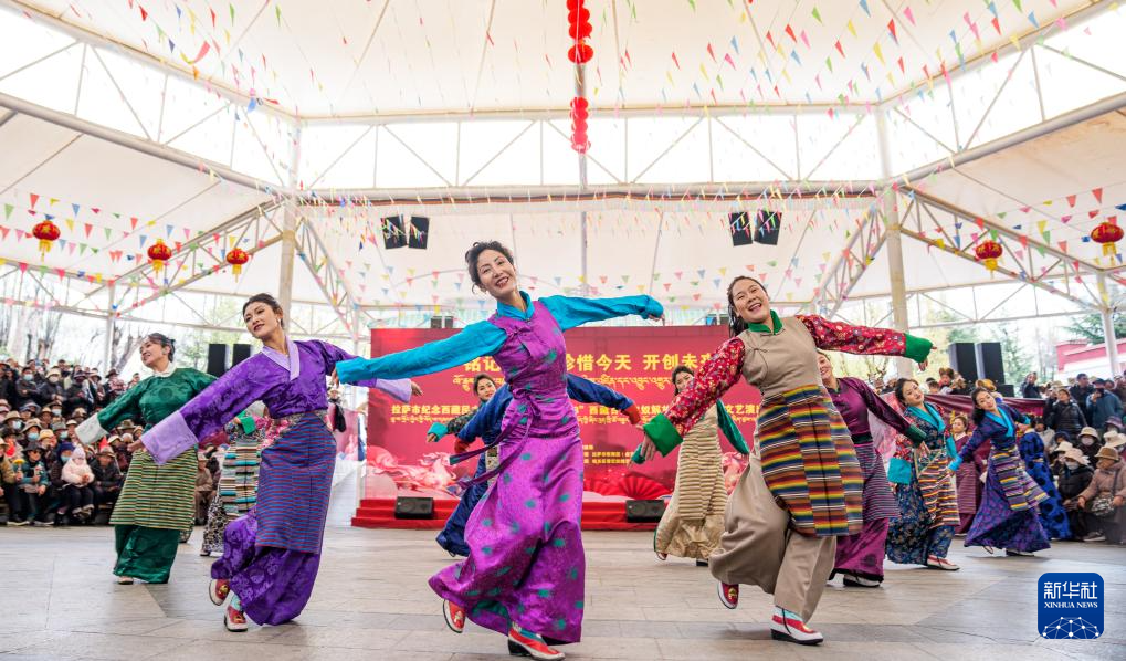 3月28日,演员在拉萨市宗角禄康公园内举办的西藏百万农奴解放纪念日群众文艺演出活动上载歌载舞。新华社记者 晋美多吉 摄