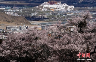 4月1日,西藏拉萨慈觉林村盛开的桃花与布达拉宫交相辉映。西藏拉萨河南岸的慈觉林村古桃树迎来盛花期,与布达拉宫构成春日美丽画卷。中新社记者 李林 摄
