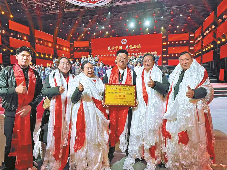 “盛世中国·幸福西藏”合唱比赛中,由向阳花(左三)指导的当雄代表队荣获二等奖。记者 刘斯宇