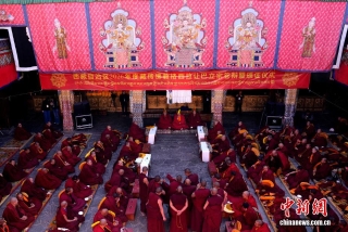 图为陪考僧人围绕藏传佛教五部经典向考僧提问。中新社记者李林摄