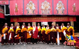 图为13名获得藏传佛教格西拉让巴学位的僧人合影留念。中新社记者李林摄