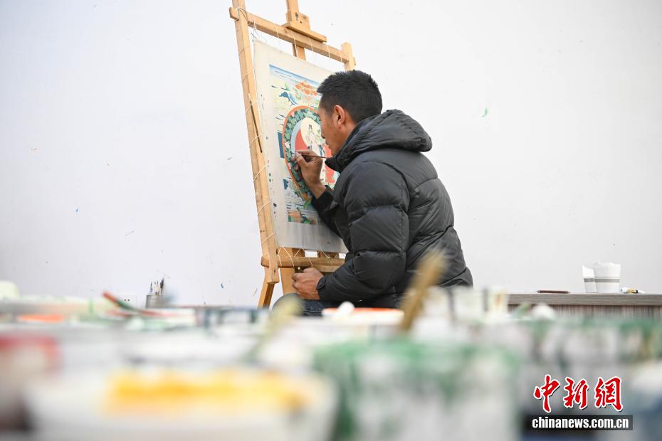 4月21日,西藏雪堆白技工学校手工艺人在绘制唐卡。中新社记者 贡嘎来松 摄