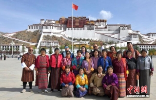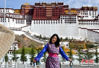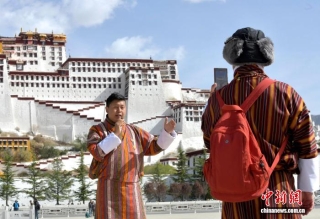 4月22日,来自不丹的游客在西藏拉萨布达拉宫广场合影留念。中新社记者 李林 摄