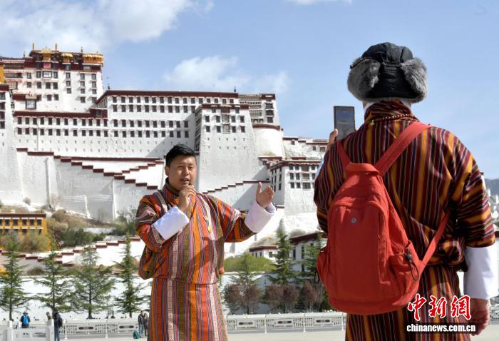 4月22日,来自不丹的游客在西藏拉萨布达拉宫广场拍摄视频。中新社记者 李林 摄