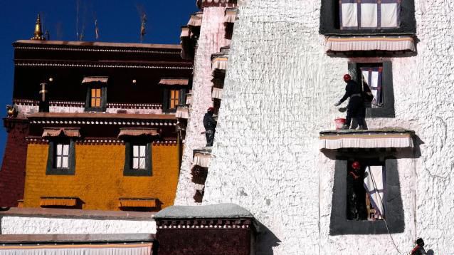 西藏布达拉宫22日迎来一年一度的粉刷“美颜”,民众自发参与粉刷工作。